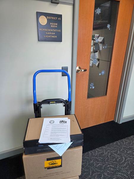 (Over 10,000 petitions from GLGR members and supporters delivered to House Judiciary Chair Sarah Lightner’s office calling for the repeal of Whitmer’s gun confiscation scheme.)